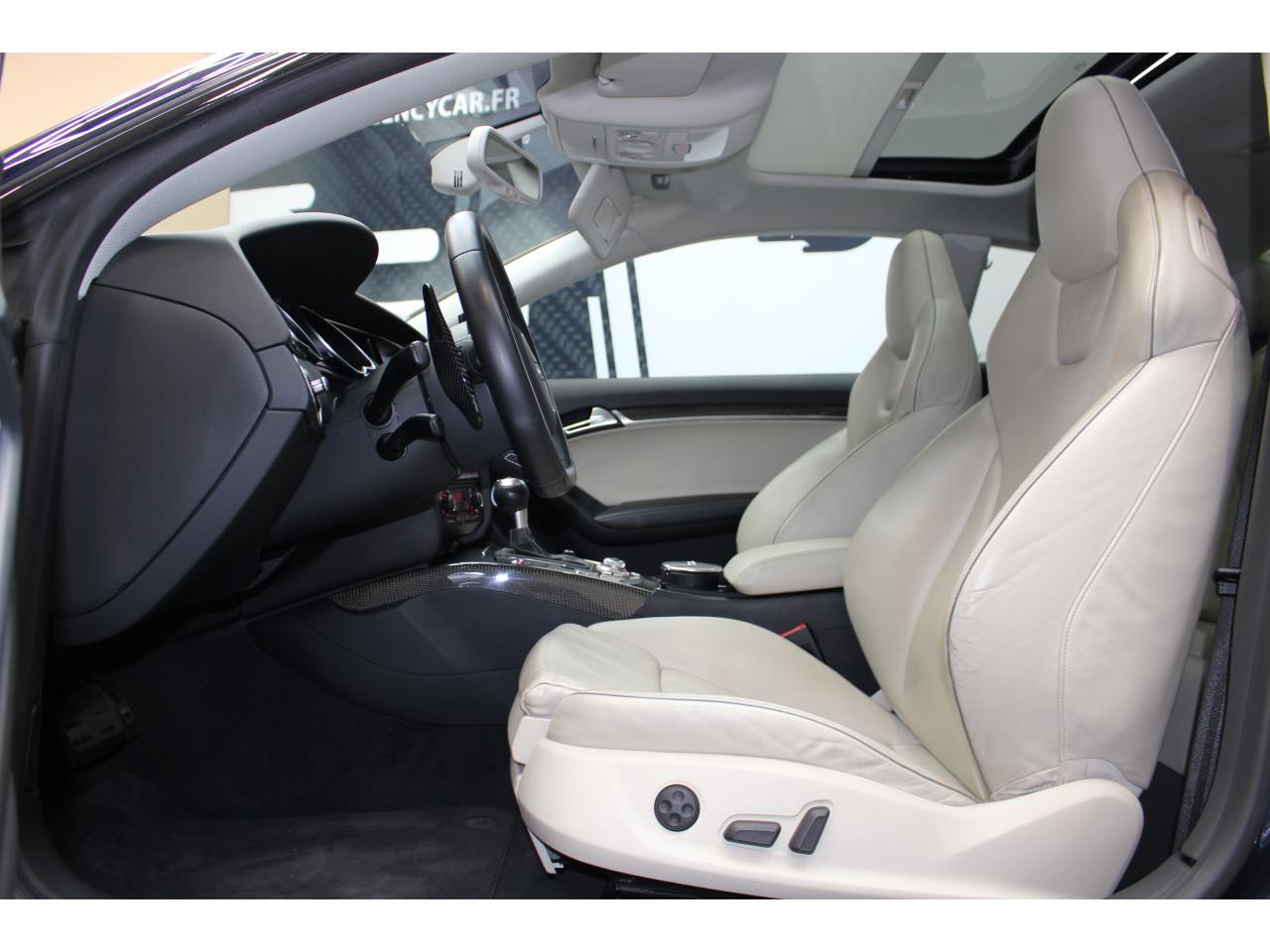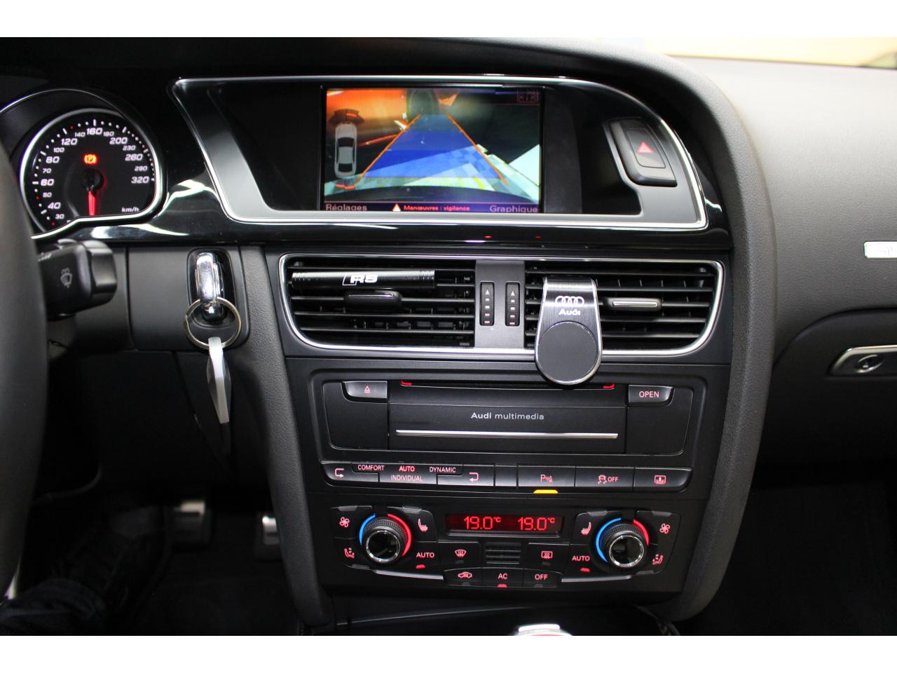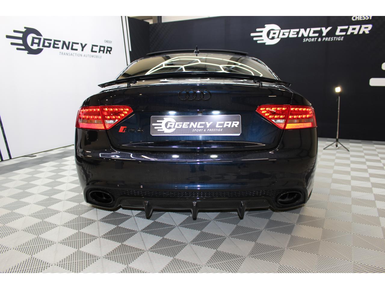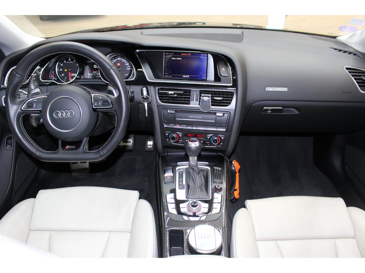 Antipatinage ASR : empêche le patinage des roues motrices ; assure une motricité optimaleApplications décoratives en carbone sur contre-portes et console centraleChâssis Sport RS avec suspension et amortisseurs plus fermes pour un contact plus direct avec la chaussée et une conduite sportiveCiel de pavillon en tissu noir ou argent étoile au choixClimatisation automatique Confort 3 zones à fonctionnalités étendues et affichage numériqueContact d'allumage électronique, clé de contact mémorisant différentes données d'entretienDétecteur de pluie et allumage automatique des projecteursEtriers de freins laqués noir avec logo RS 5Inscriptions RS 5 sur les seuils de portes, les étriers de freins, la calandre, la malle de coffre, le volant, le levier de vitesses S tronic, le compte-tours et la cléQuattro : transmission intégrale permanente avec répartition asymétrique et dynamique de coupleSièges Sport S à l'avant avec appuis-têtes intégrésSorties d'échappement ovales à gauche et à droiteVolant Sport multifonction en cuir perforé style 3 branches avec emblème RS 5, surpiqûres contrastées gris pierre, palettes de changement de vitesse style aluminium pour S tronic derrière le volant, airbag grand volume, réglable en hauteur et en profondeurXénon Plus incluant réglage automatique du site des phares, feux diurnes par bandeau de LED et lave-phares, feux arrière à LED pour feux de position et de stop